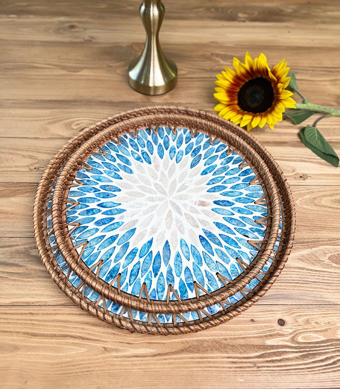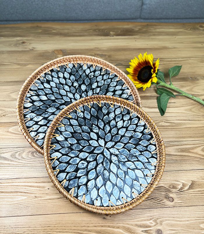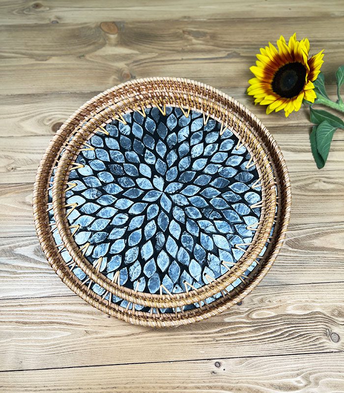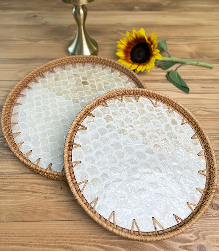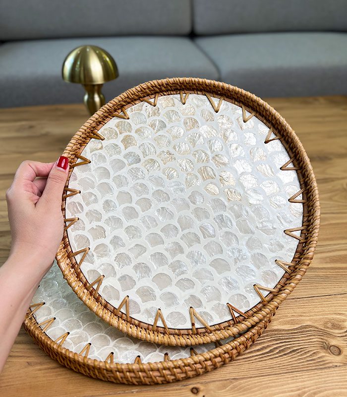 سینی صدفی از جنس صدف طبیعی دستساز و حصیر راتان